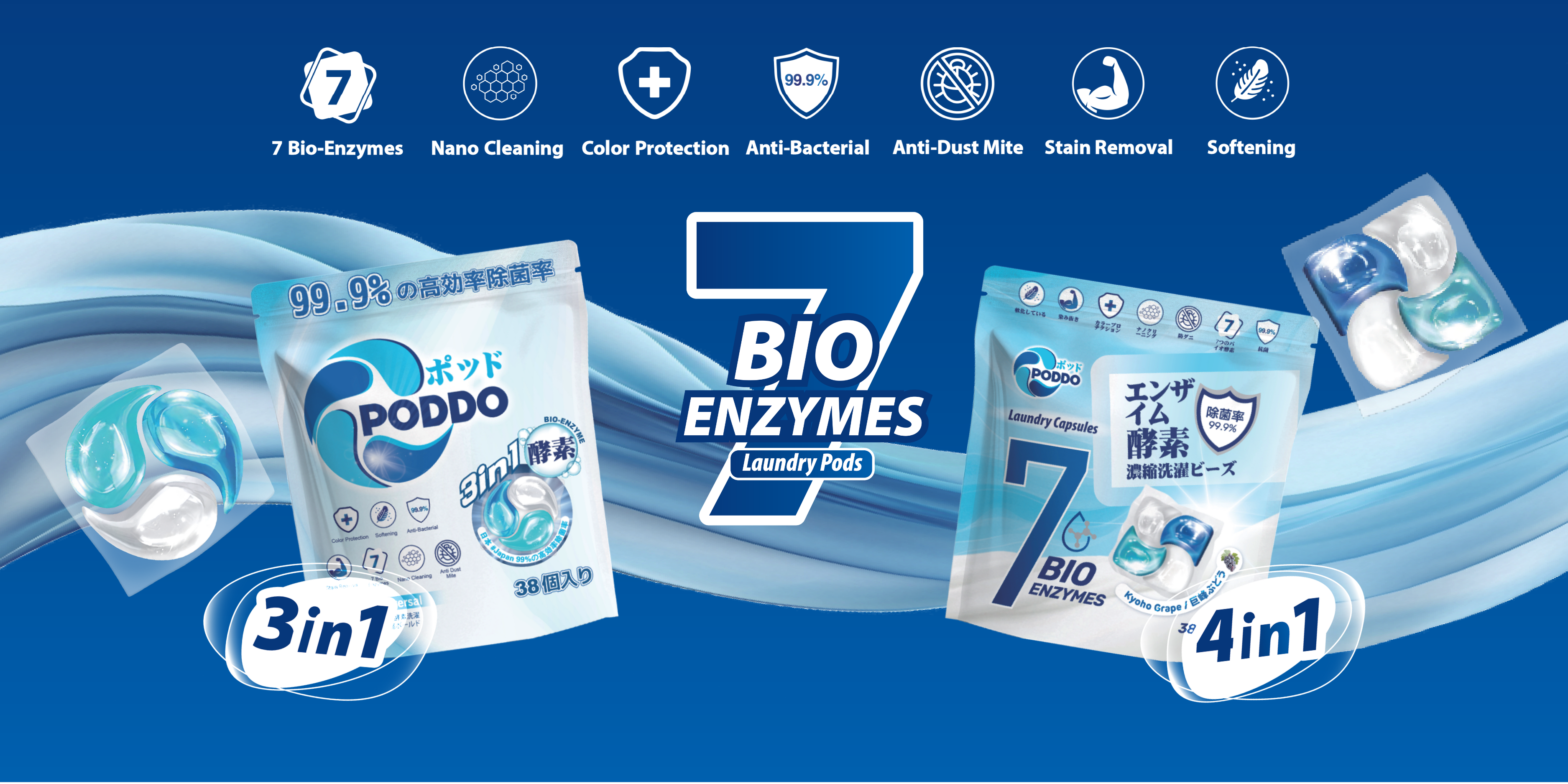 Experience the future of laundry with Poddo's capsules, featuring 7 powerful functions and bio-enzyme technology. Made in Japan and designed for ultimate convenience and effectiveness. Poddo transforms your laundry routine.